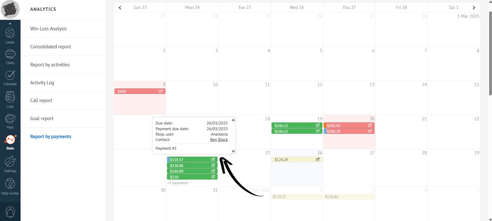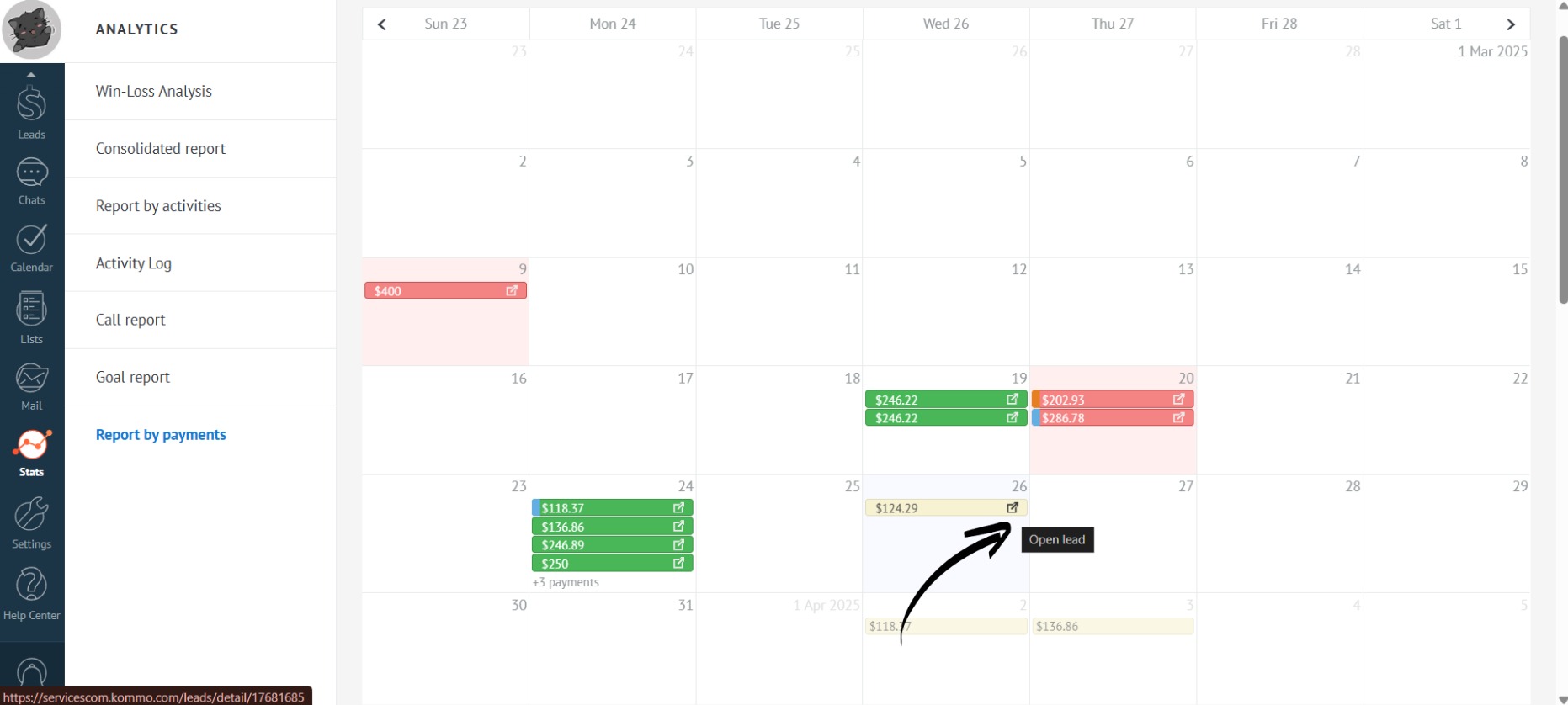 - To navigate to the lead, click on the arrow to the right of the amount: