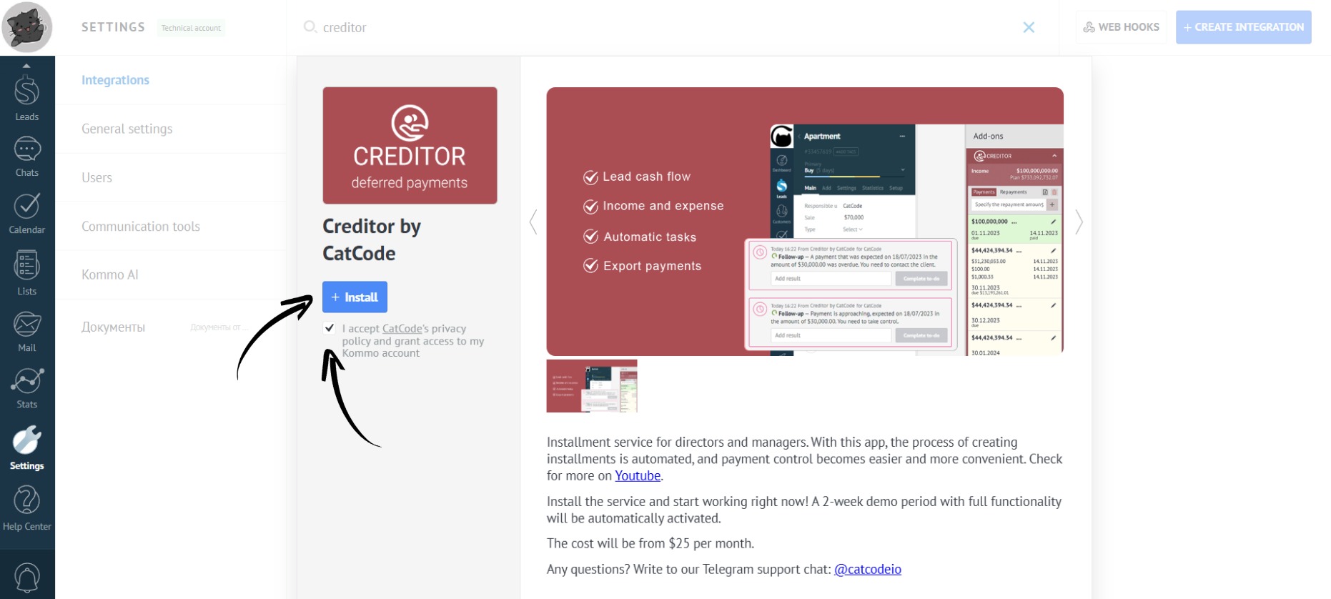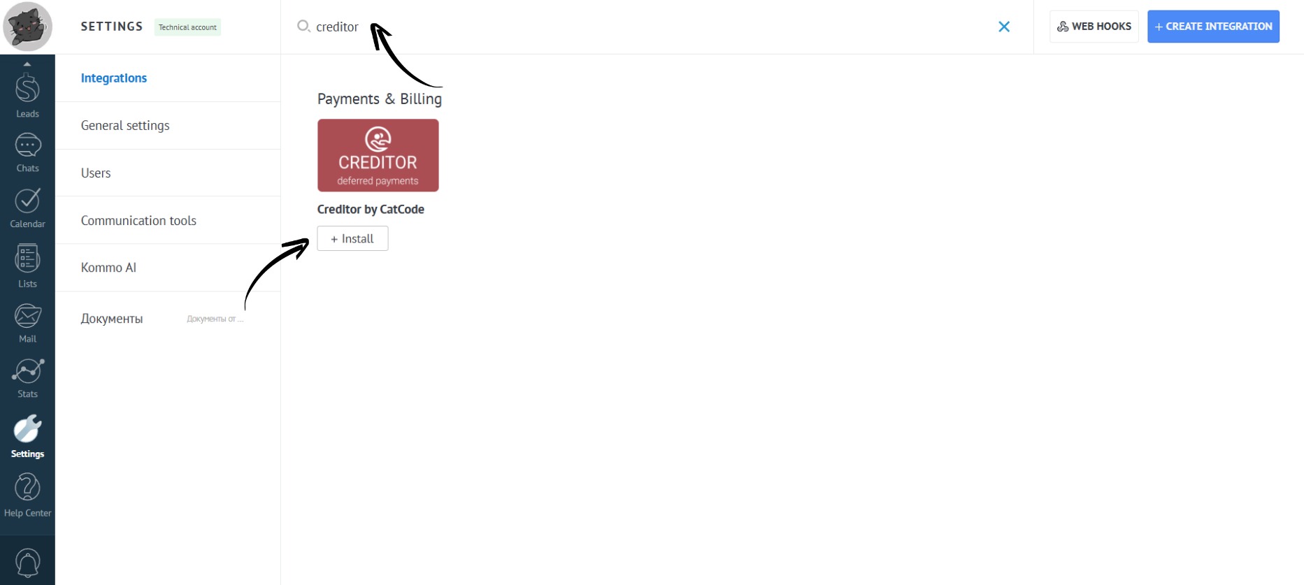 - Go to the “Settings” section. Open the “Integrations” tab: