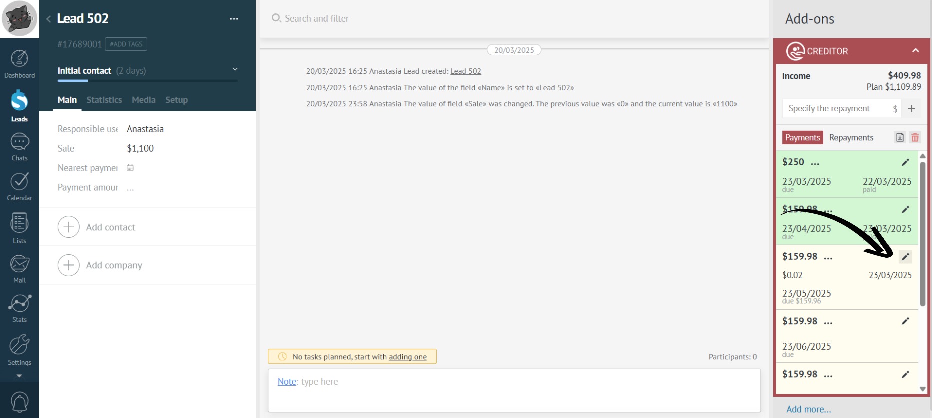 - Click on the payment editing icon: