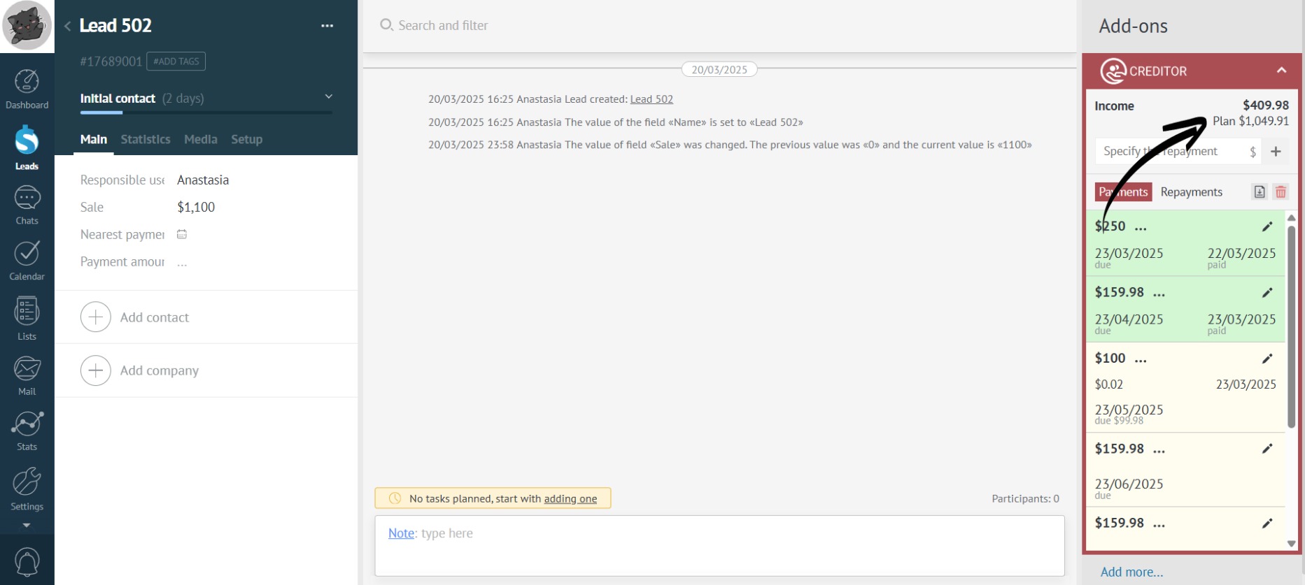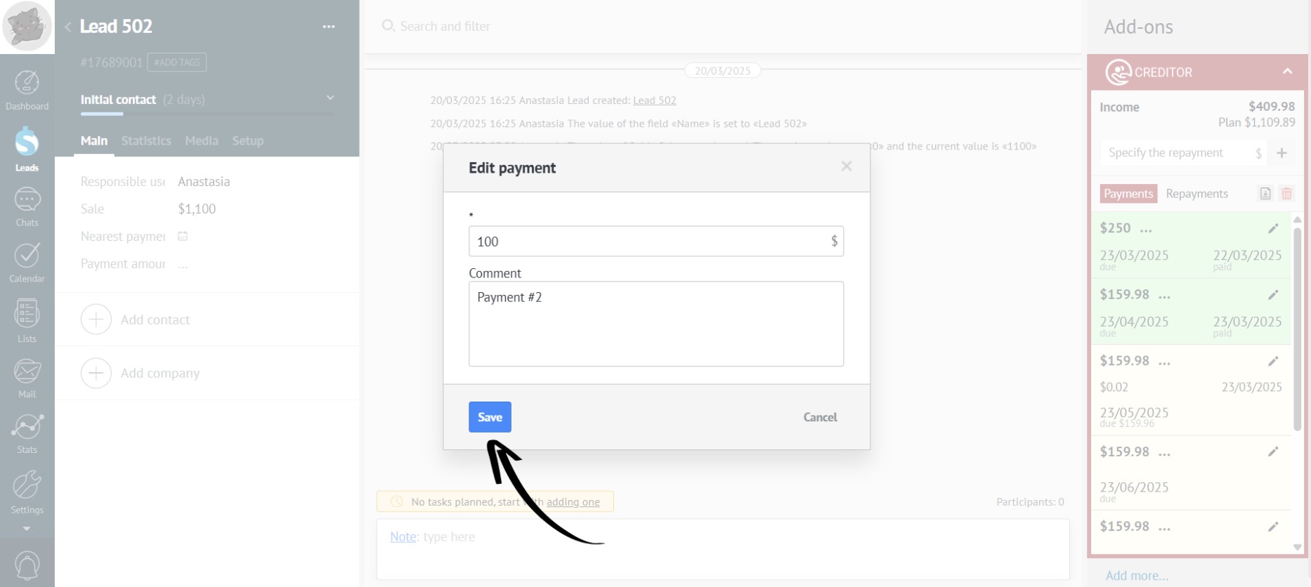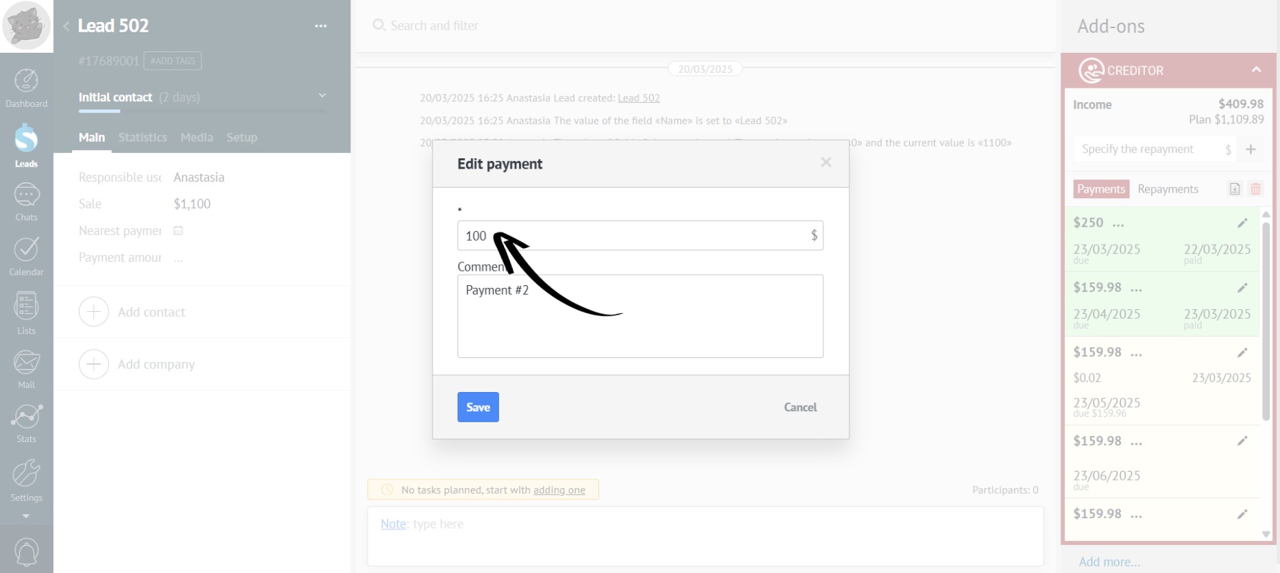 - When editing a payment, the planned revenue also changes: