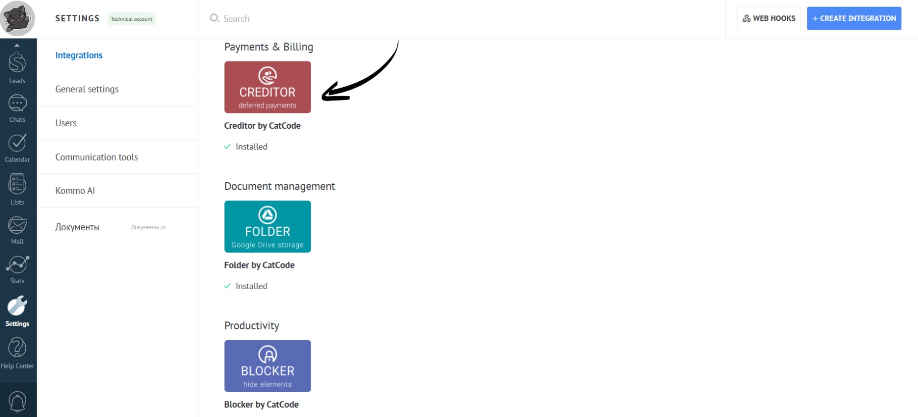 - Go to the “Settings” section. Open the “Integrations” tab: