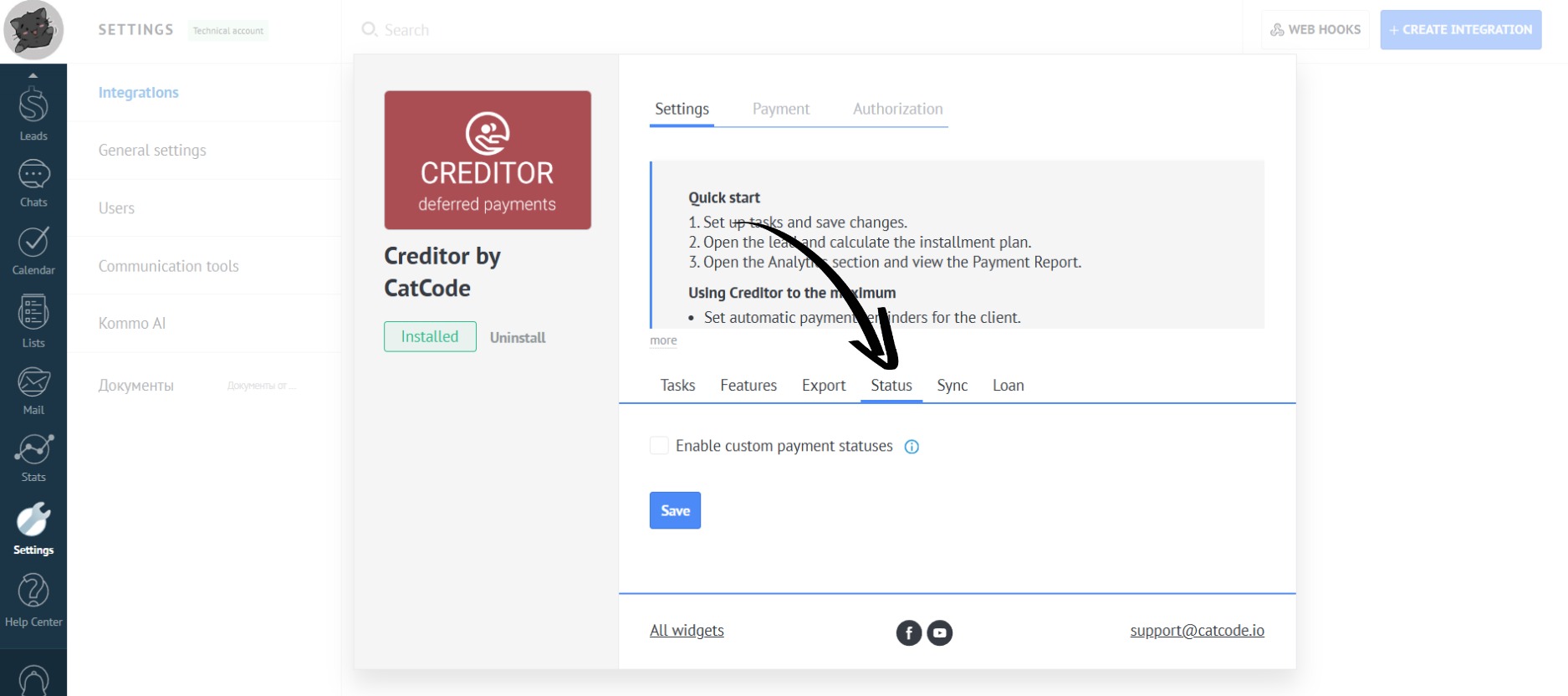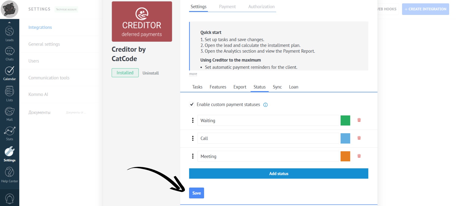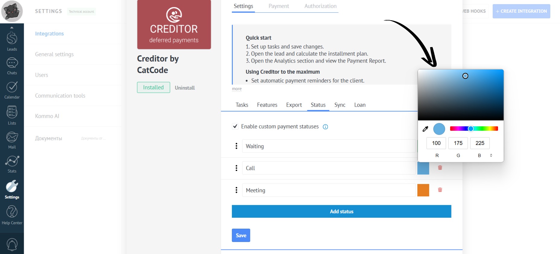 - Creating a pipeline for payments: easily track sales stages using different custom statuses (payment received - green, awaiting response - orange, etc.).