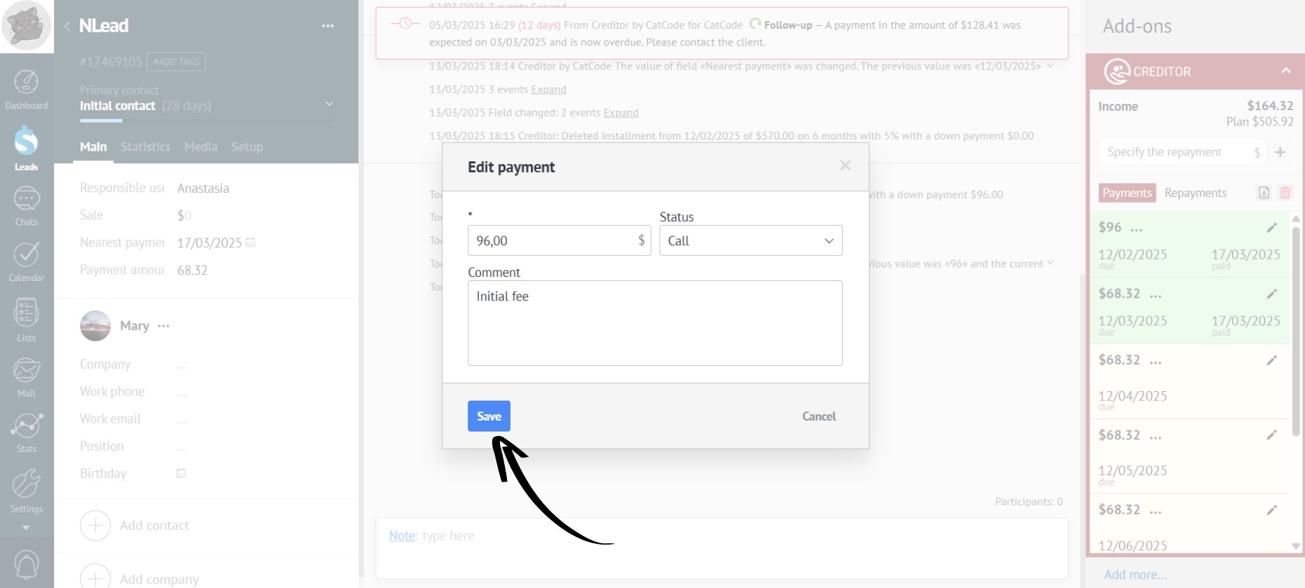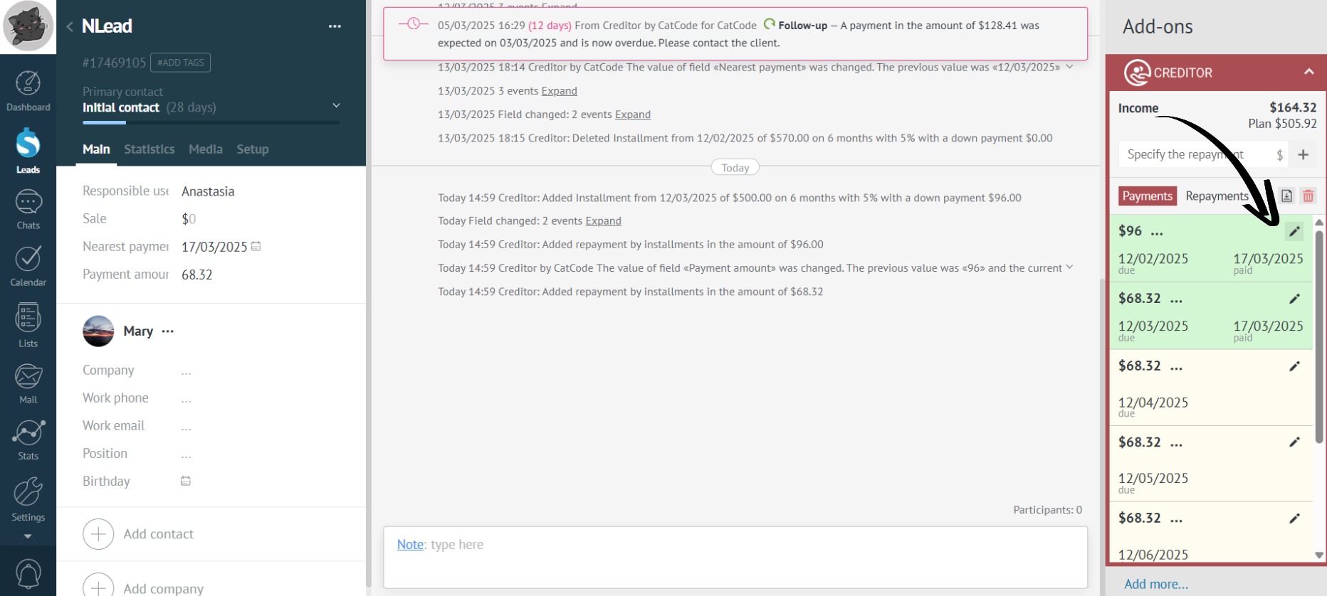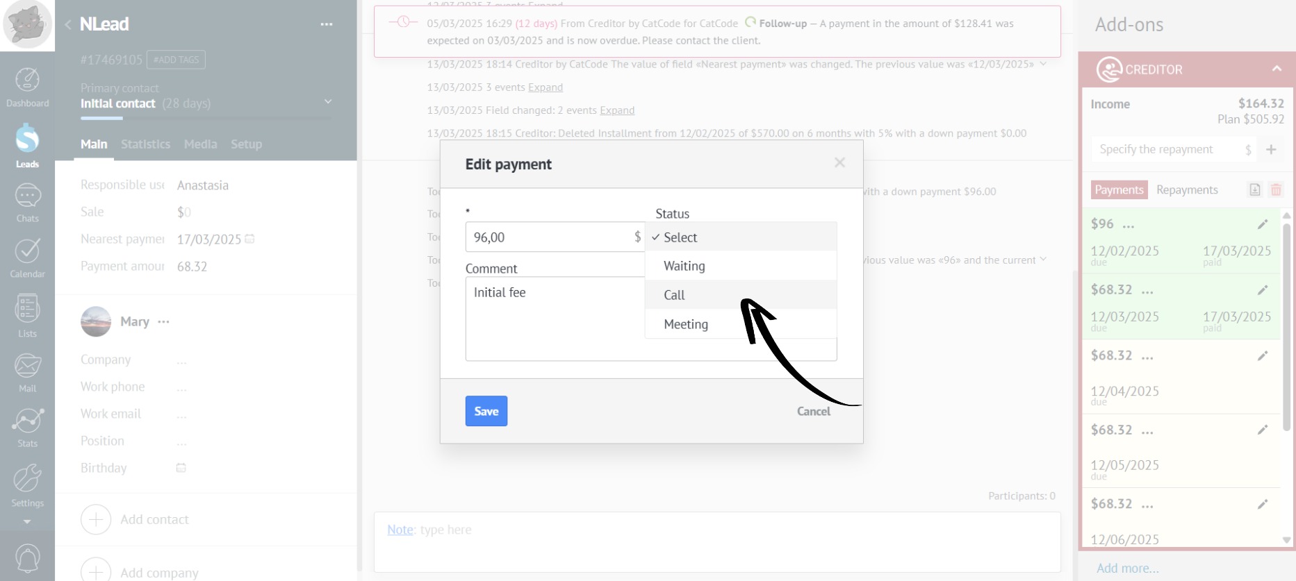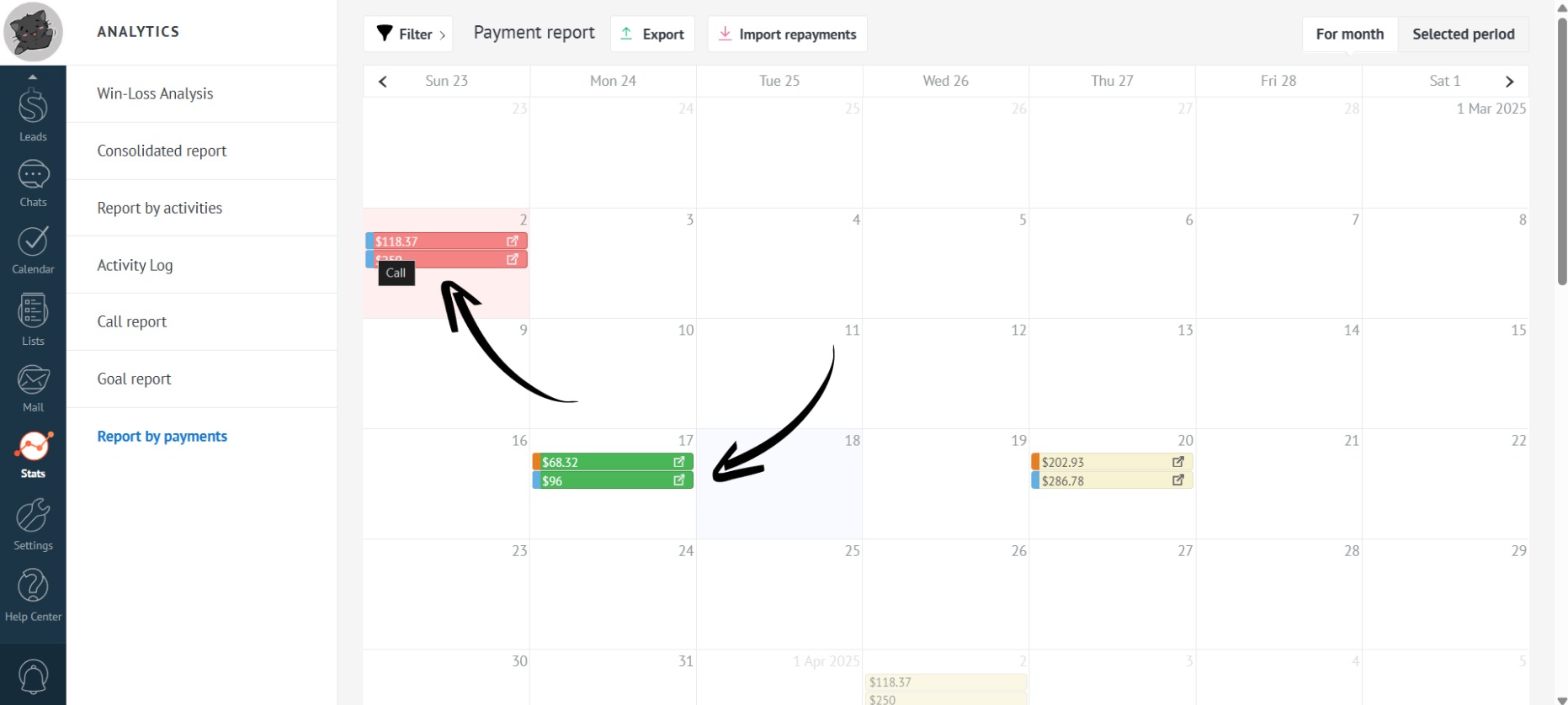 Having trouble tracking sales stages, payment methods, or canceled payments? Classify payments with color coding to quickly navigate the stats section and lead card.