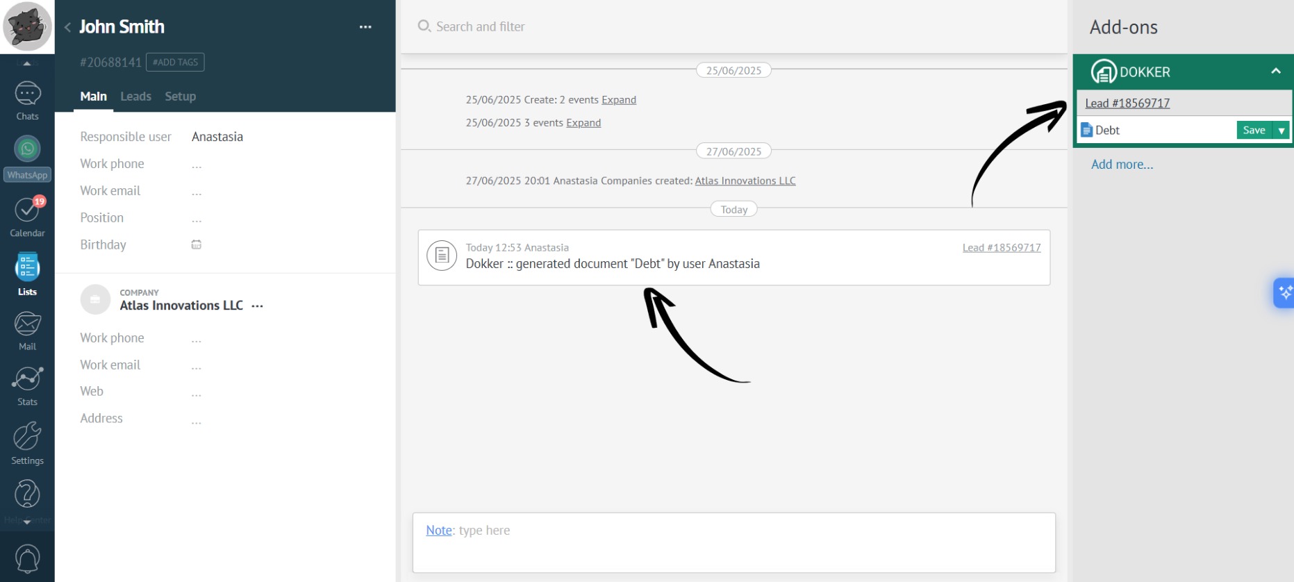 You can’t generate a document in the contact card, but you can see all the generated documents for all of the contact’s leads: