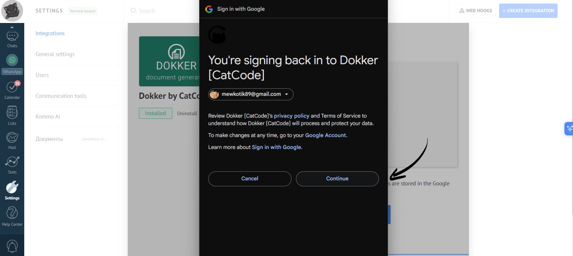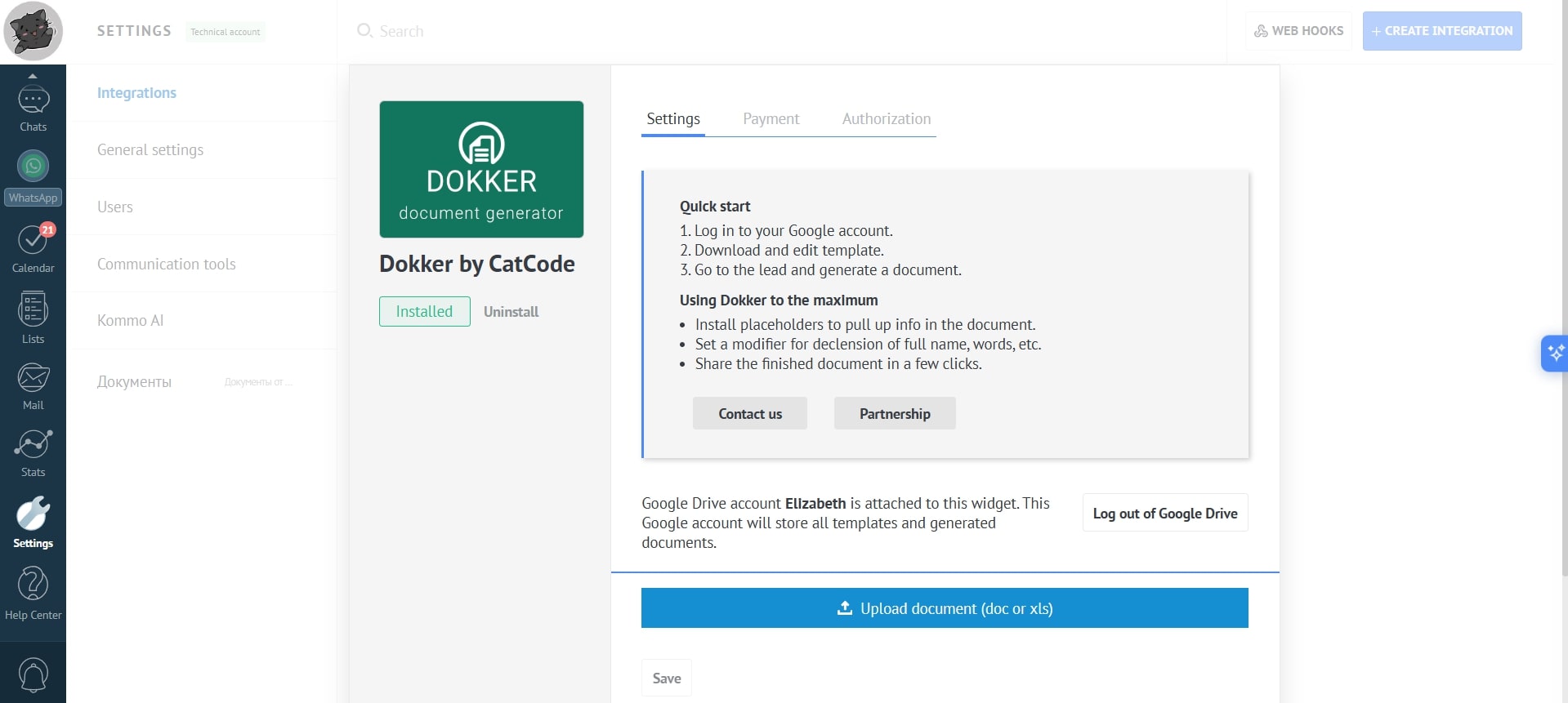 - After setting up the app, Dokker will appear in the right panel of the lead: