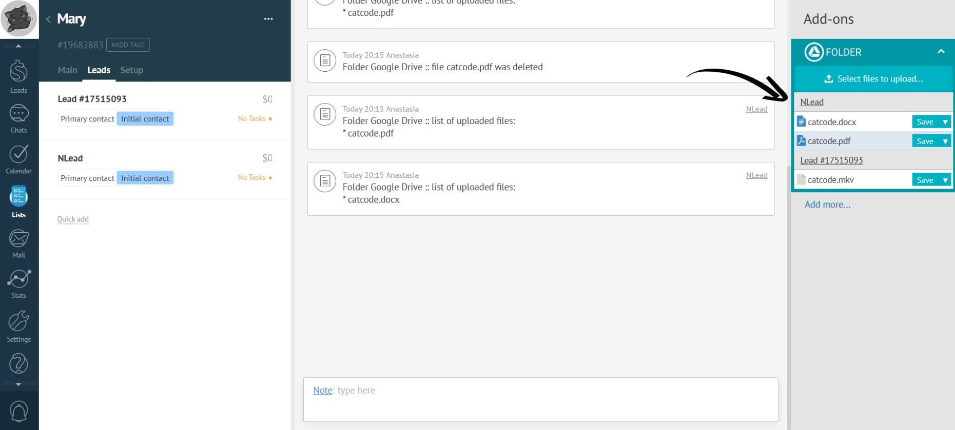 In a contact and company lead, files of all related leads are visible: