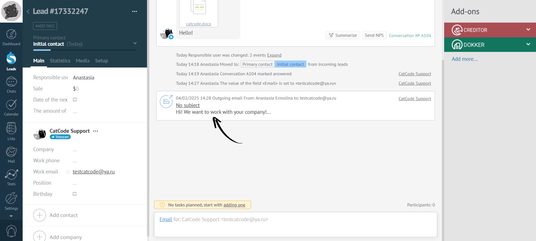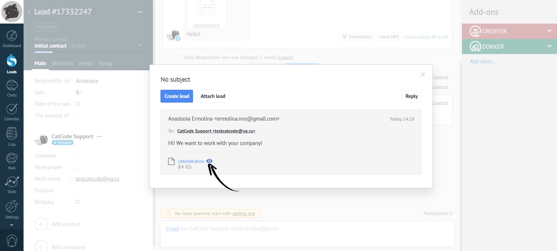 - Emails are attached to the corresponding leads at the specified email address. Click on the email’s subject line to open it: