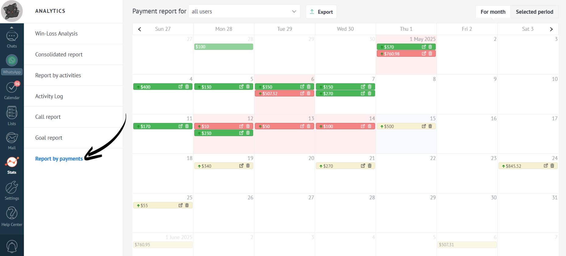 The payment calendar is located in the “Stats” section under the “Report by payments” tab. Use it to get a complete overview of payments and your company’s financial status.