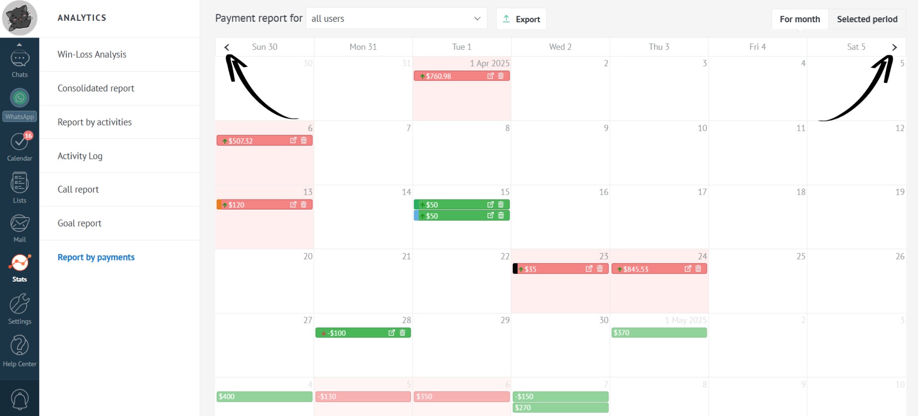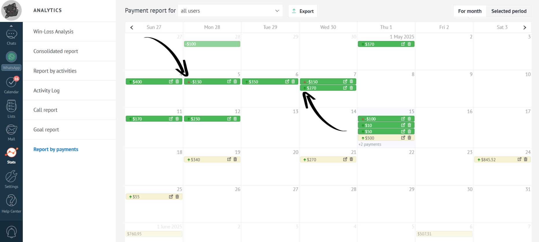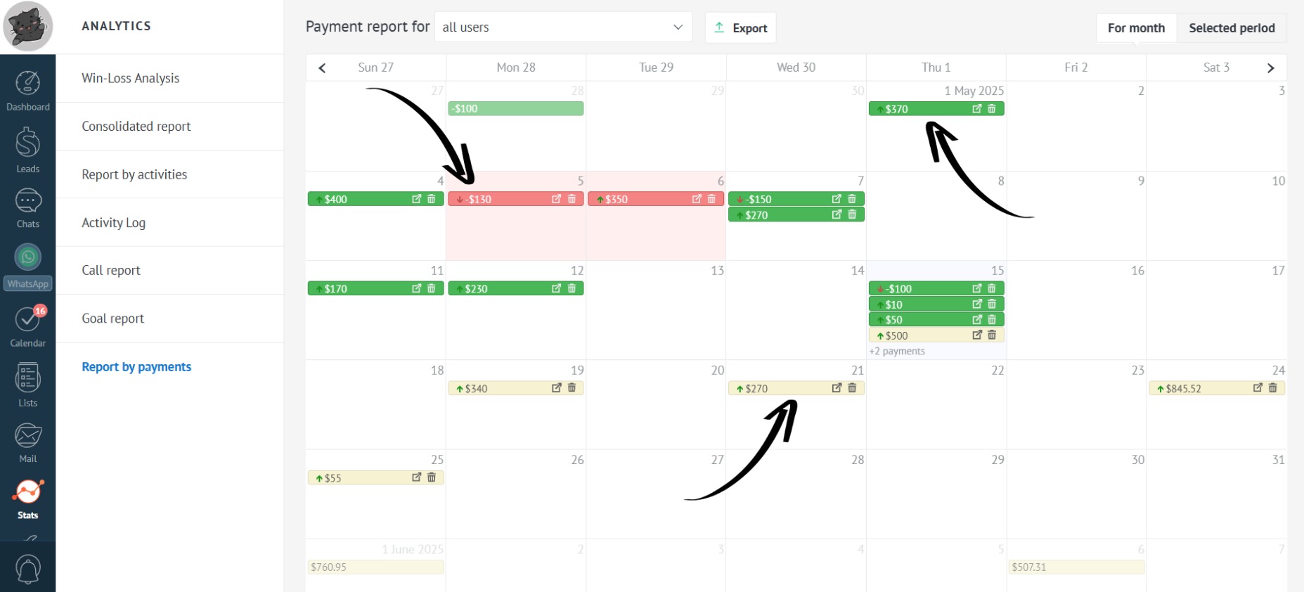 See all payment types for your company’s leads in one place. Analyze the performance of the entire department or a specific manager.