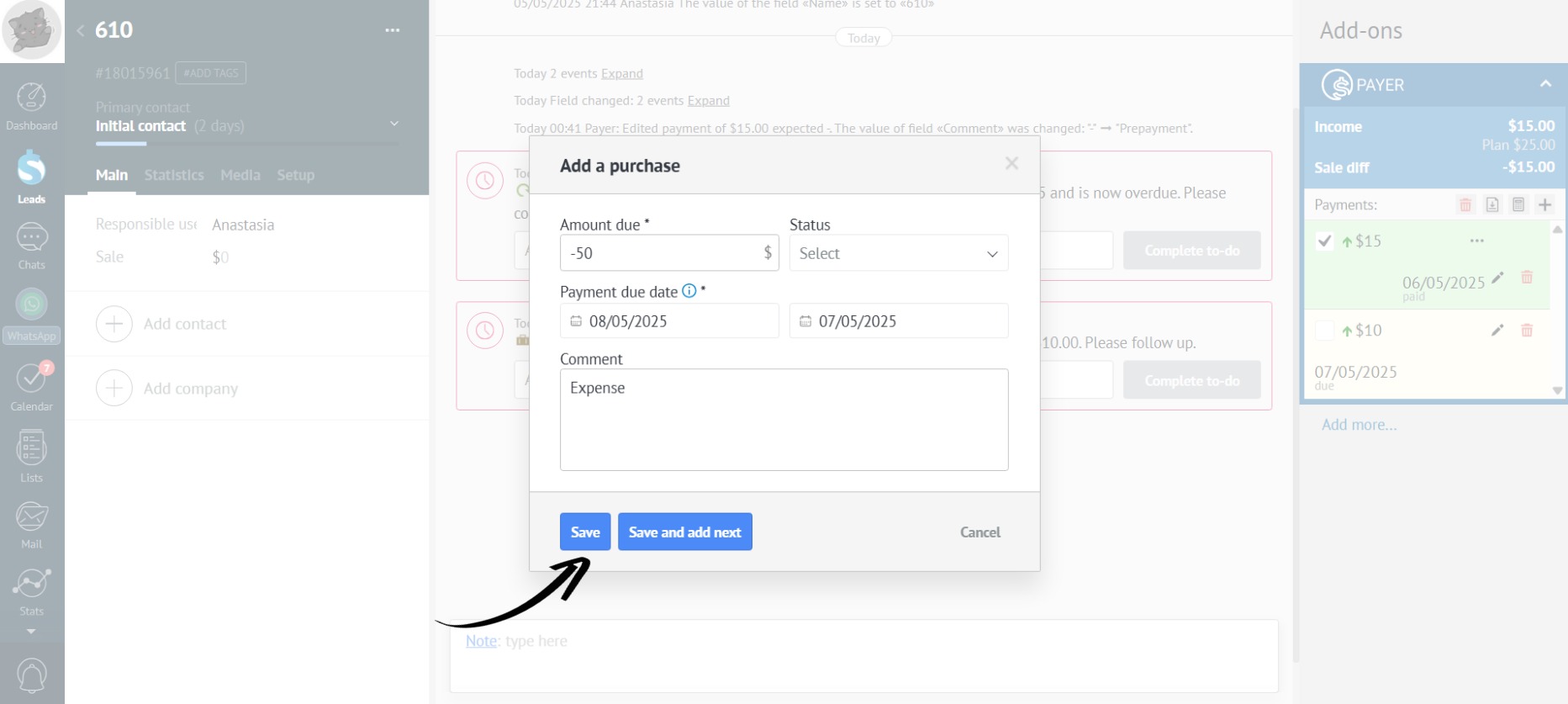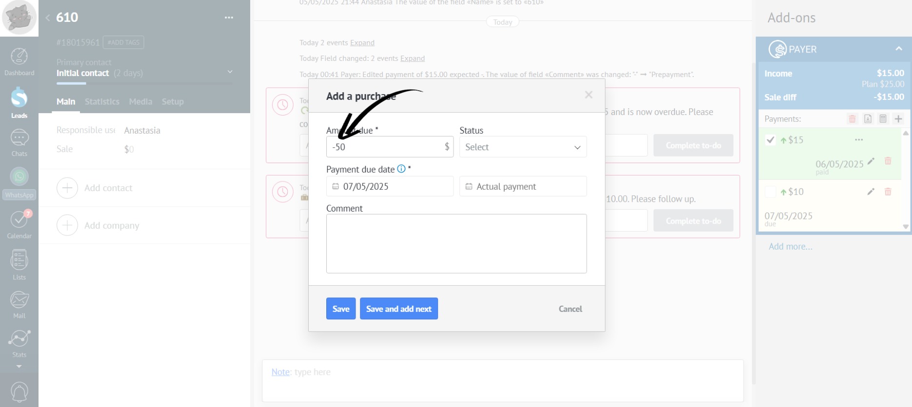 - To add an expense, put a minus sign (-) before the payment amount: