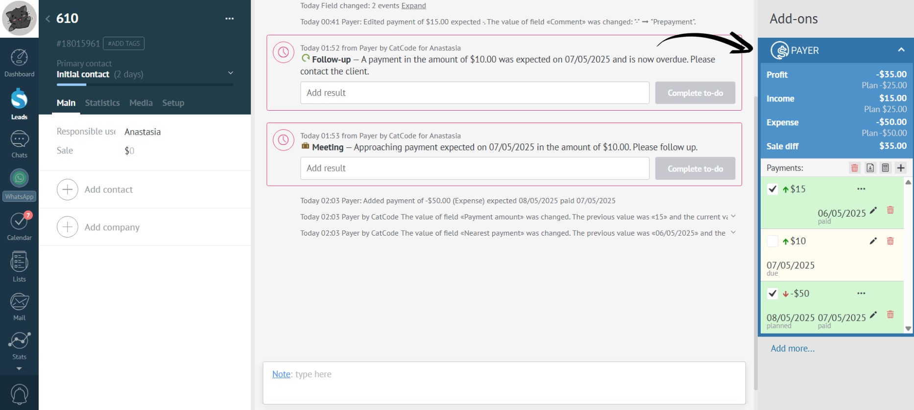 - After adding an expense, Payer automatically calculates expenses, income, and profit: