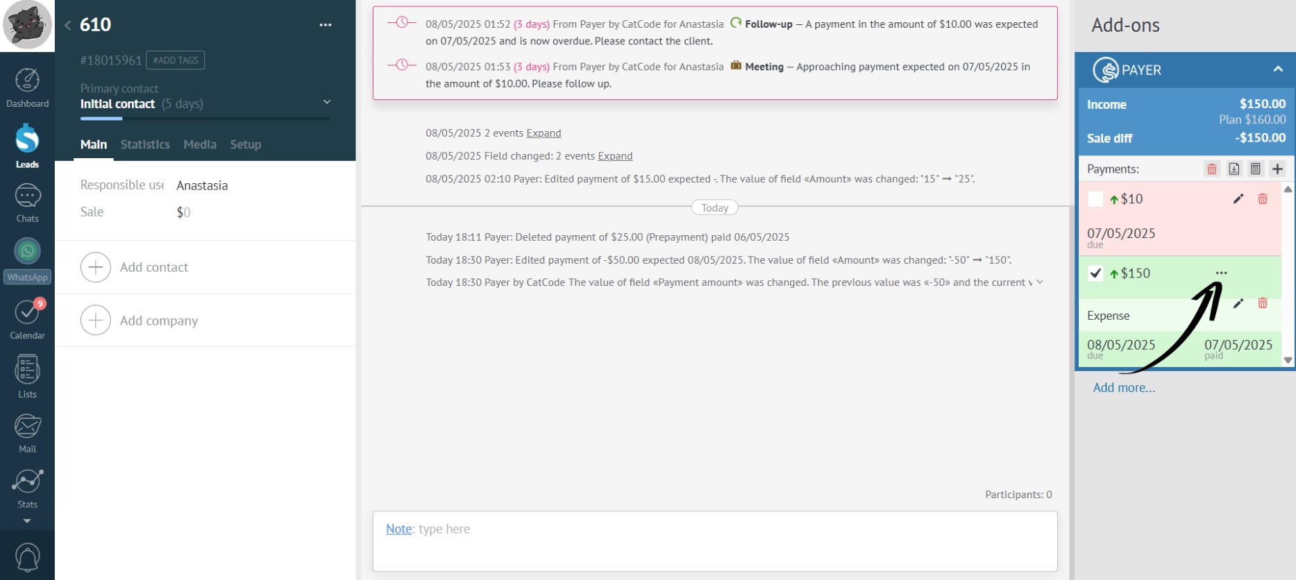 To open the comment, simply click the three dots to the right of the payment amount: