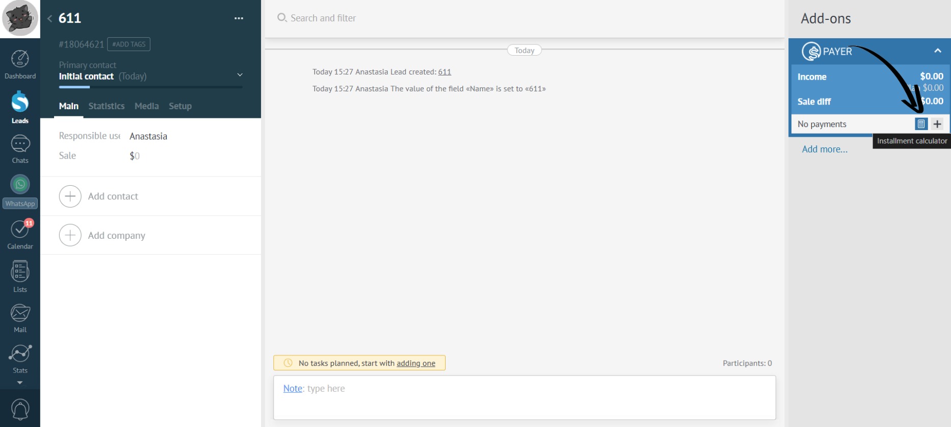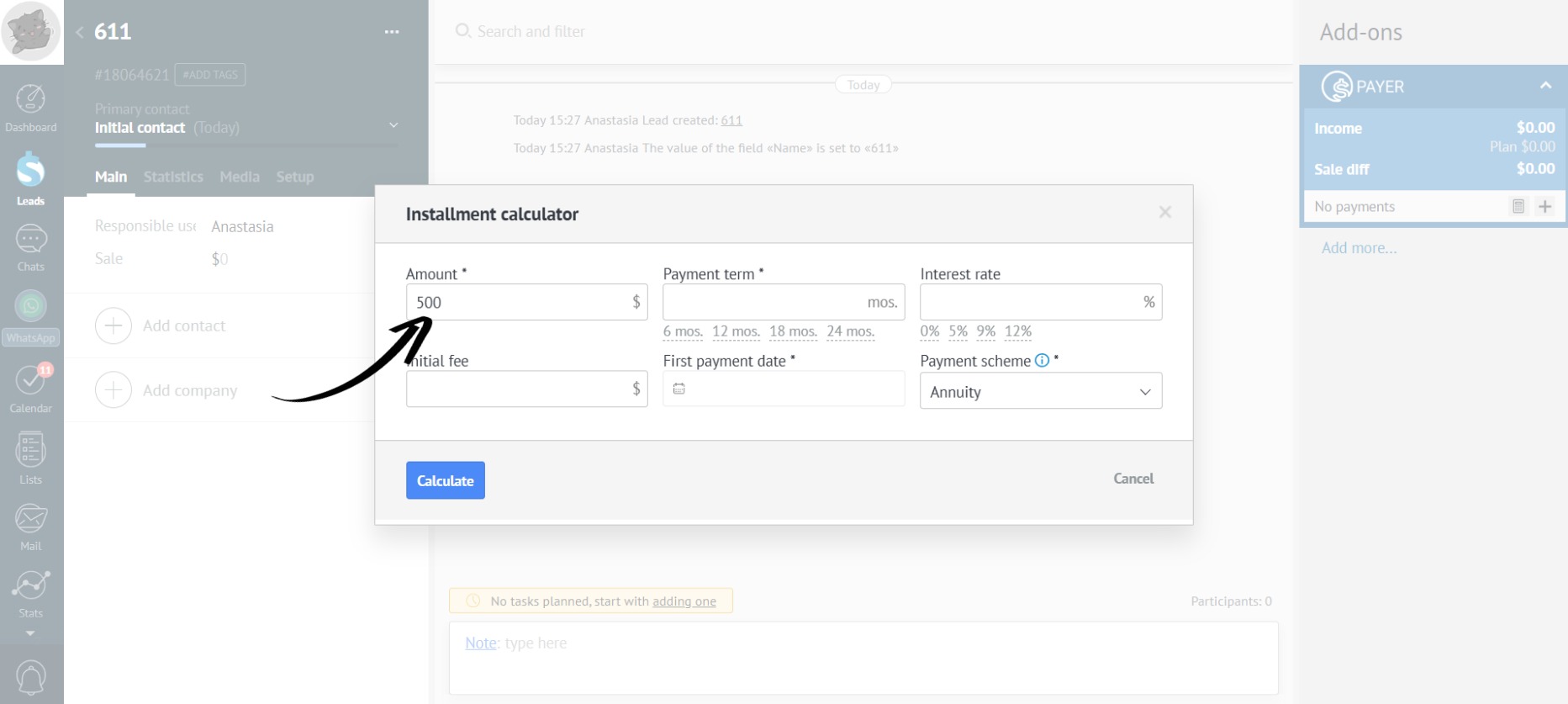 - If the lead has a budget amount, it will automatically populate the “Amount” field in the calculator. Or, manually fill in the “Amount” field in the “Calculator”: