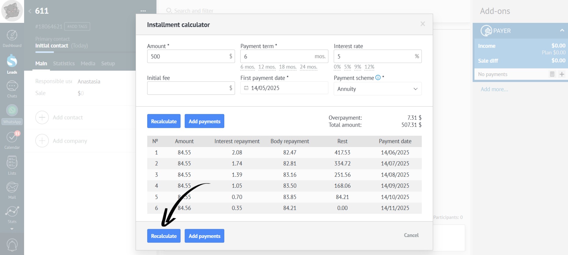 - If you need to recalculate the installment plan, enter the updated data and click the “Recalculate” button: