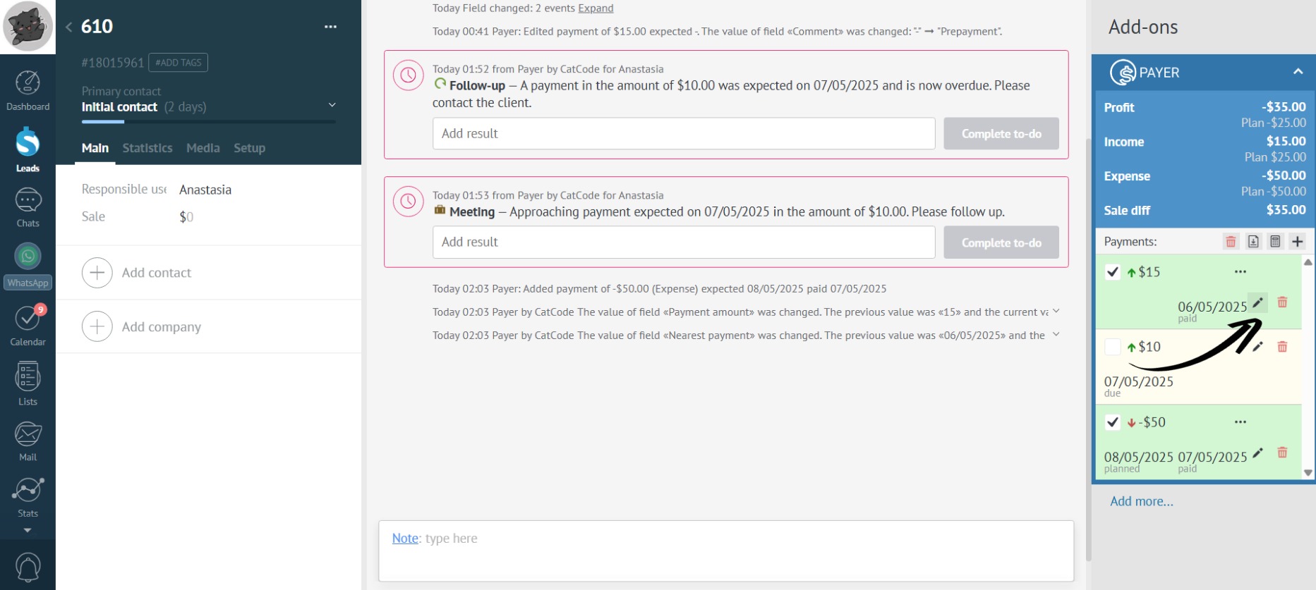 - You can edit a payment by clicking on the pencil icon next to the desired payment: