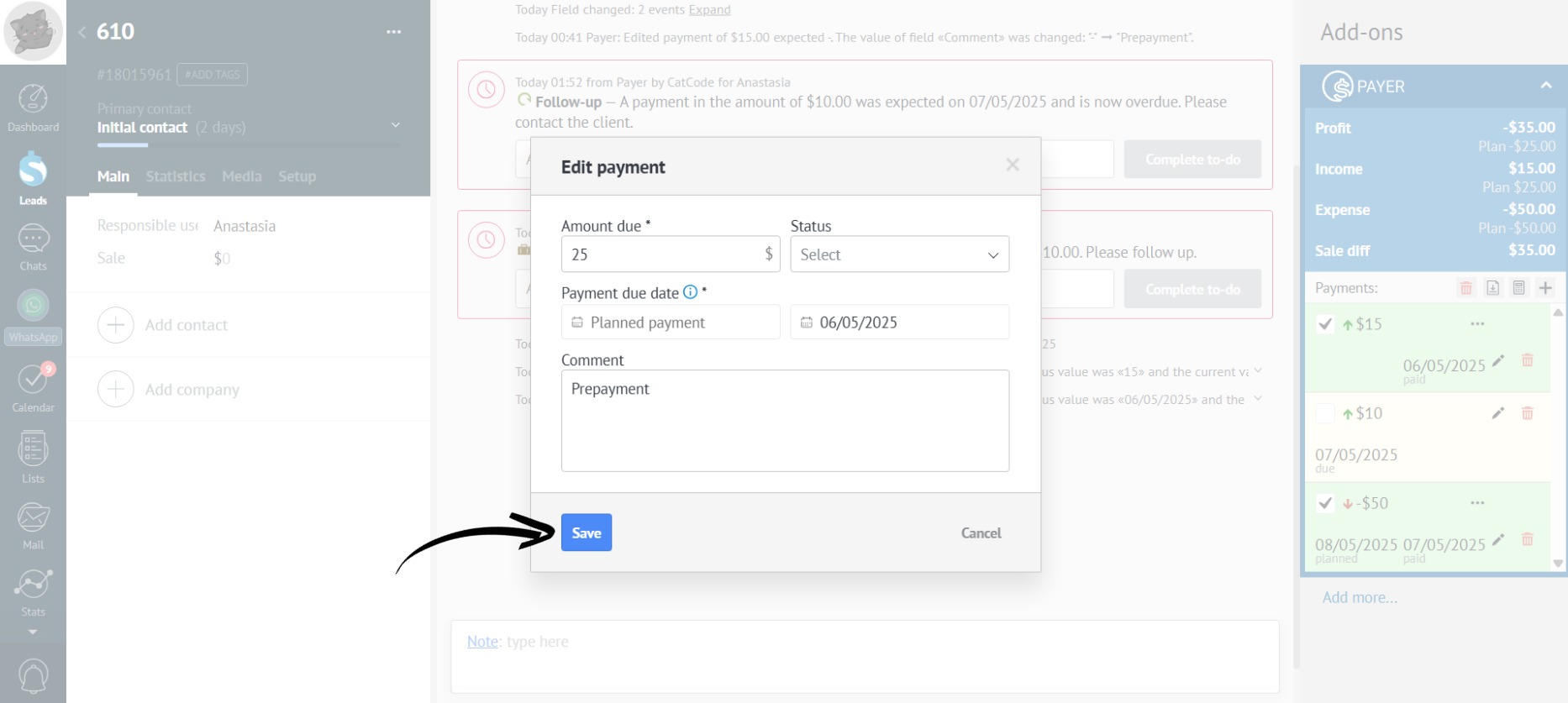 - You can change the payment date, the payment amount, or add a comment. After making the necessary changes, click the “Save” button:
