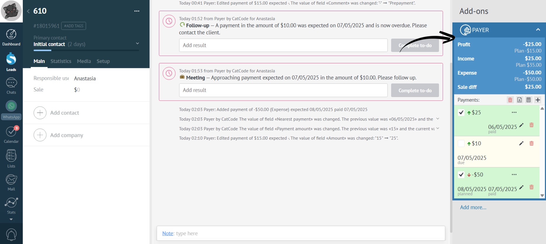 Need to update a payment date, amount, or add a comment? Edit a payment with a single click.