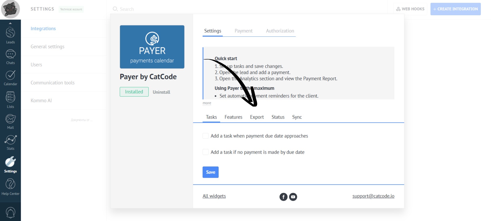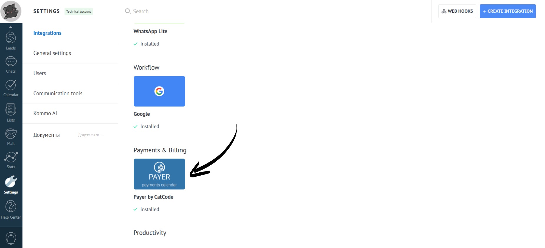 - Go to the “Settings” section. Open the “Integrations” tab: