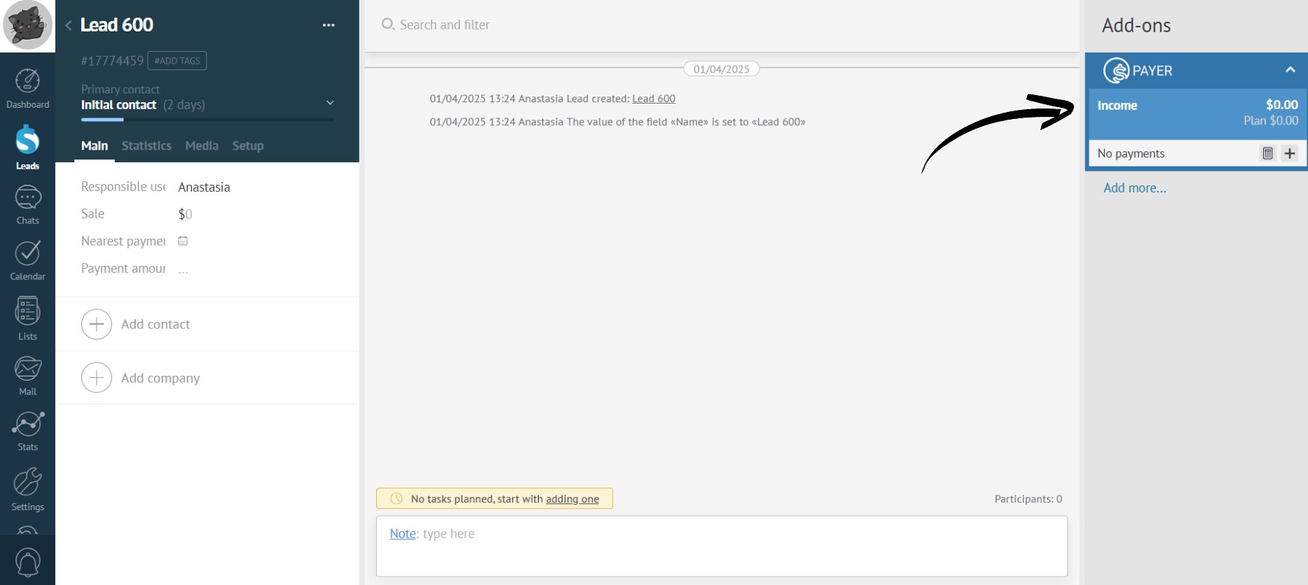 The app will be displayed on the right side of the lead. With it, you can add income, expenses, and installment plans: