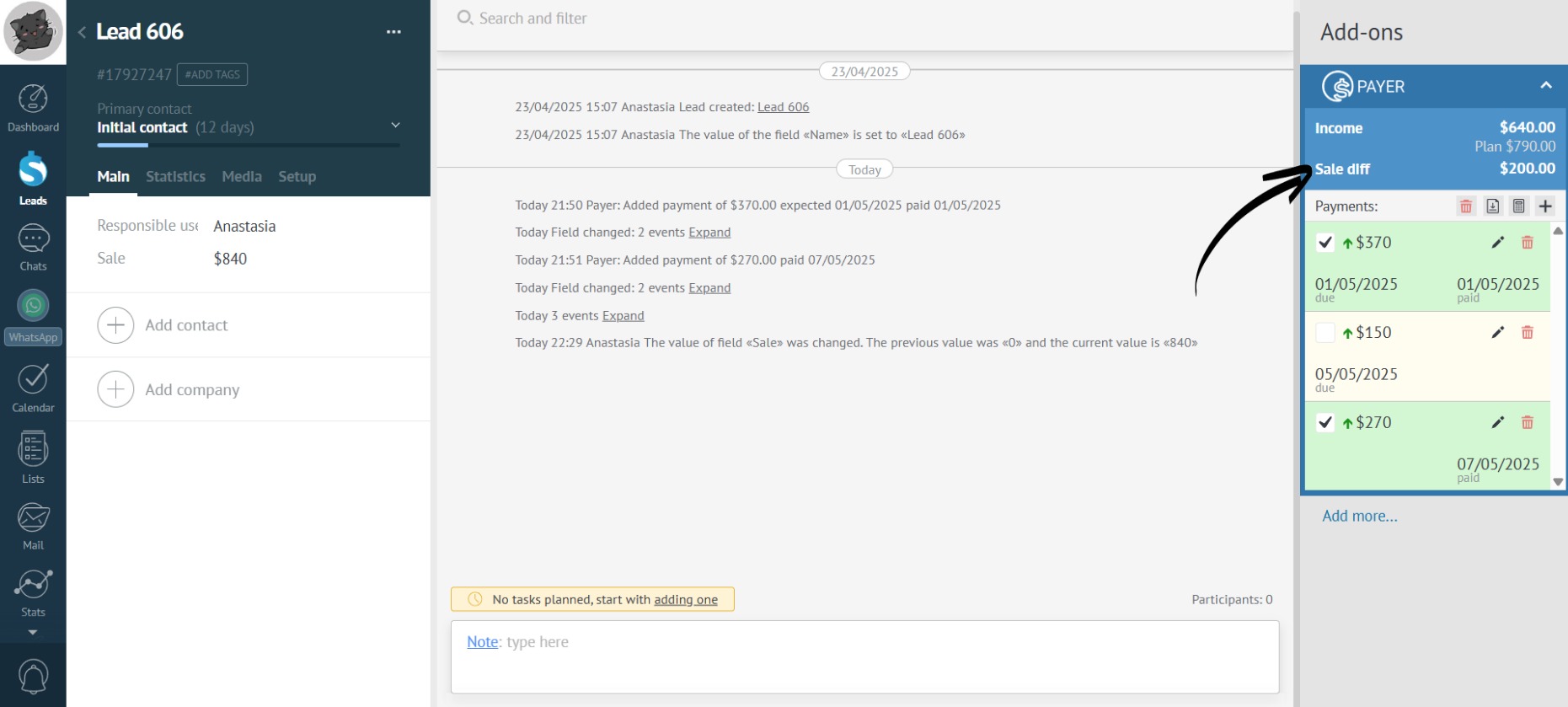 - In the lead card of the app, there will be a “Sale diff” field displayed – the difference between the current payments and the lead’s budget: