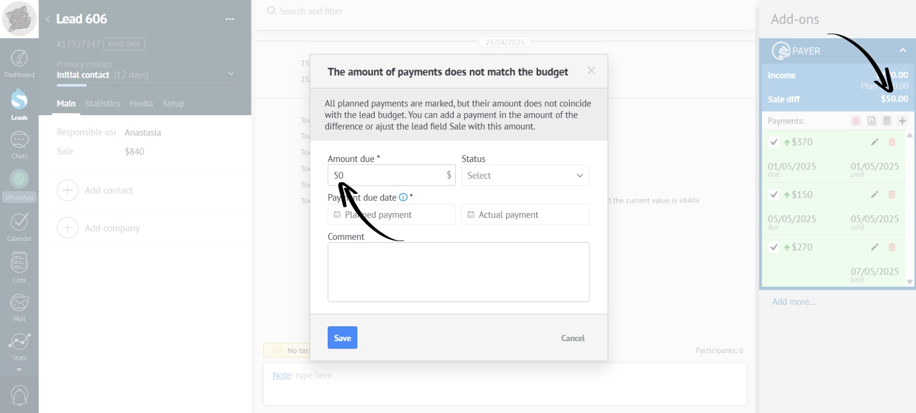 - When marking the final payment as received, if the sum of the paid payments in the lead doesn’t match the budget, a pop-up window will appear to add a new payment for the difference: