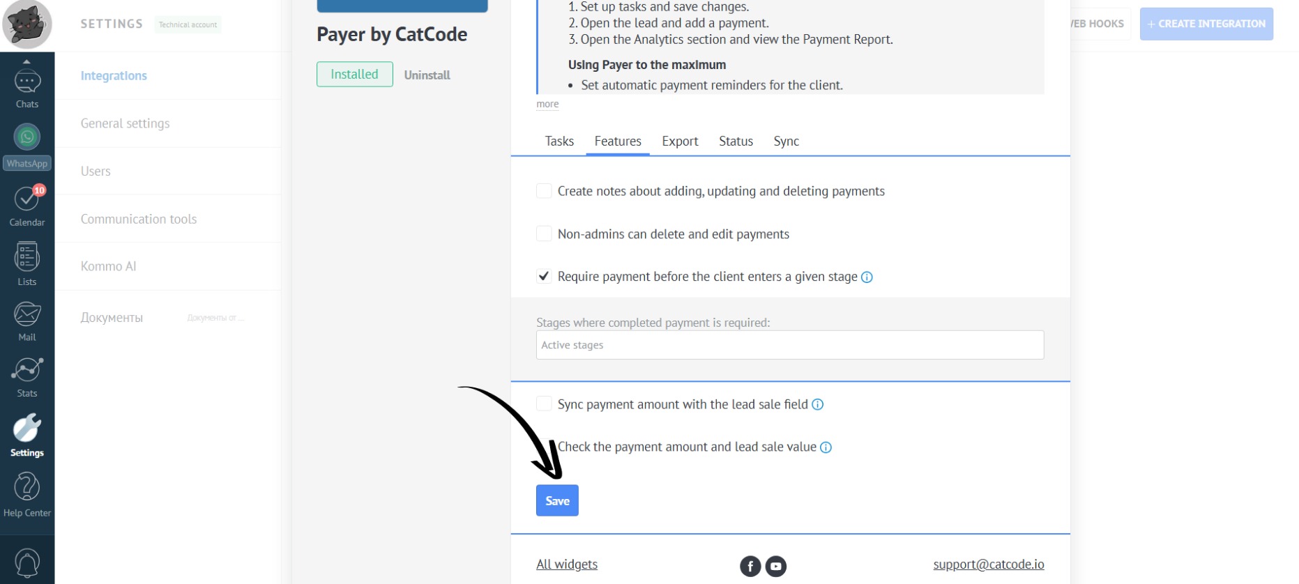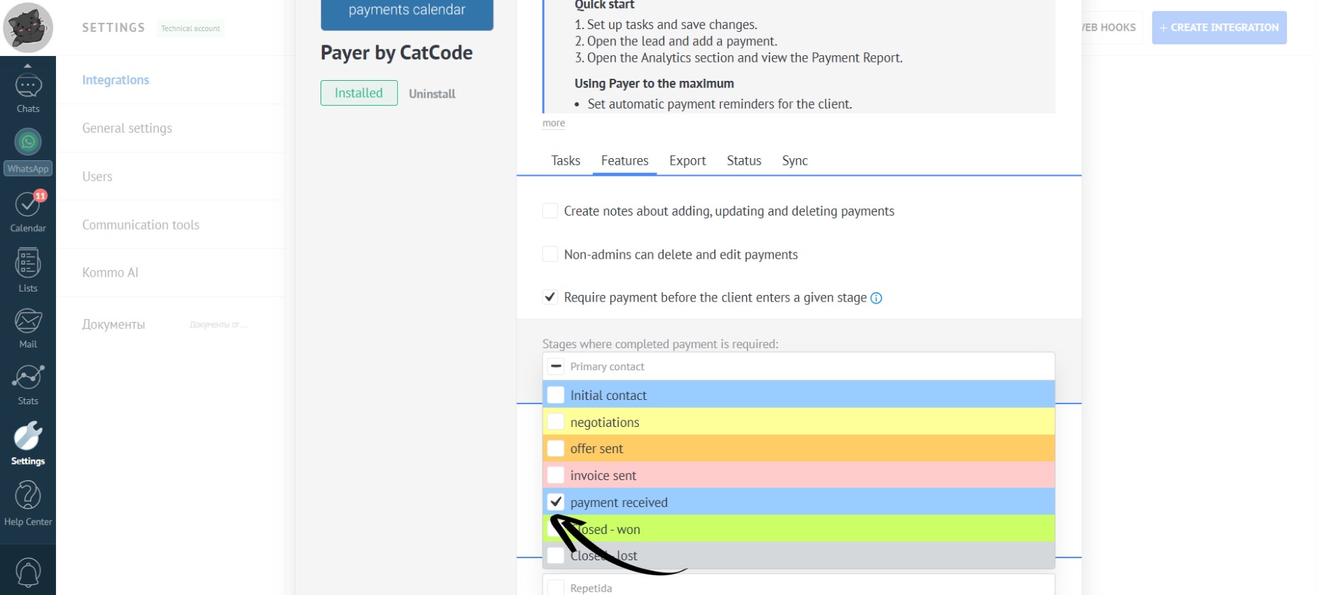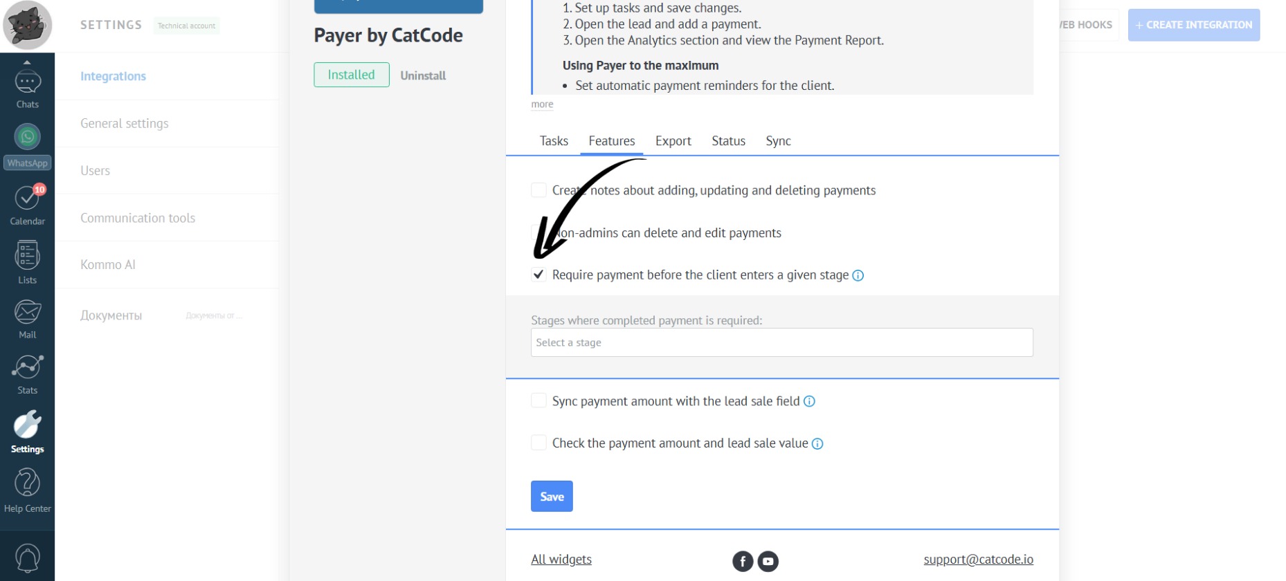 - In the app settings, go to the “Features” section. Check the box next to “Require payment before the client enters a given stage” to automatically verify that all payments are completed in the selected lead statuses: