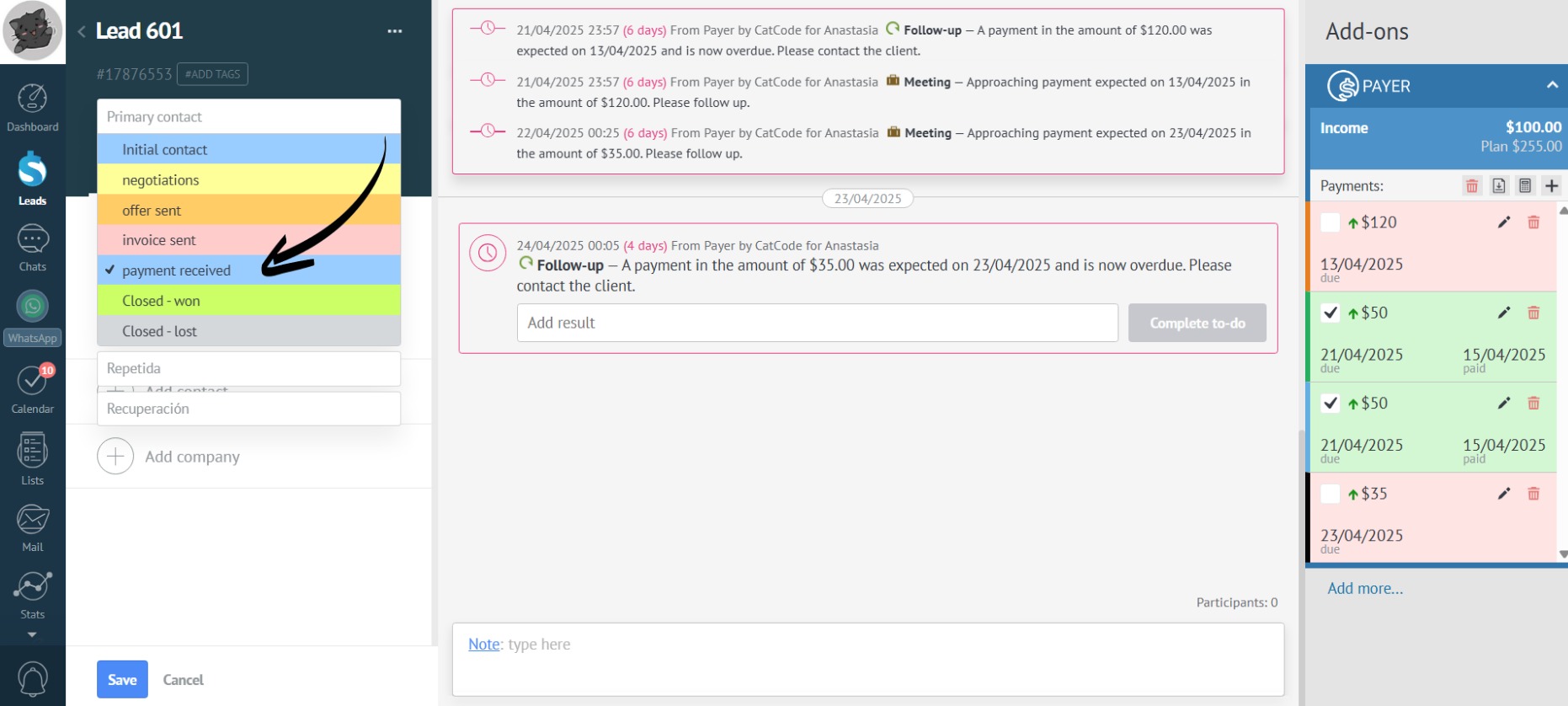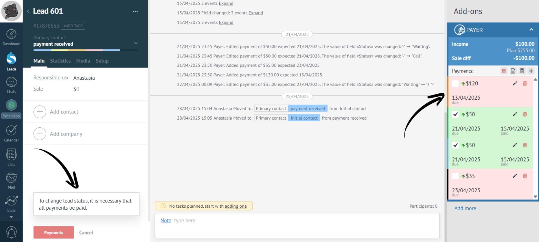 - You try to move the lead to the “Payment received” stage (if you previously selected this status). The app won’t allow you to do this, as payment hasn’t been received for all payments in this lead: